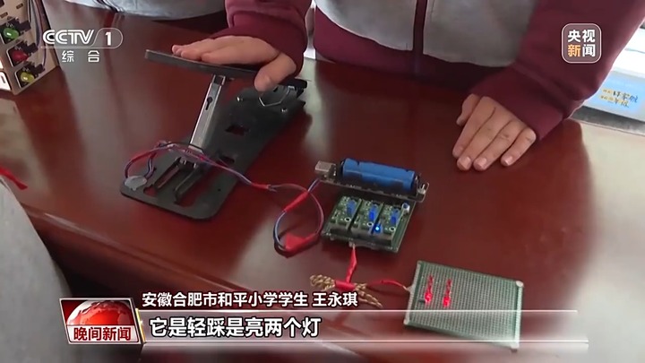 安徽合肥市和平小学学生 王永琪:这个寒假做了一个智能刹车,它是轻踩亮两个灯,然后重踩亮四个灯,然后再重一点,是亮六个灯,这样可以防止两个车因为刹车力度不同而造成的事故。