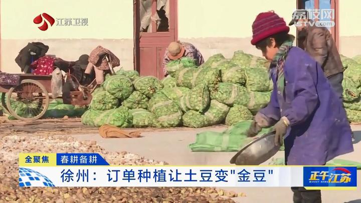 在徐州邳州市四户镇的订单土豆选种基地,工人们正有序地进行土豆种植前的选种、切割以及晾晒工作。经过精心挑选处理,优质种子由货车运送到田间地头进行播种。