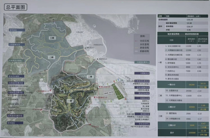 除了大熊猫,占地952亩的一期项目还将包括金丝猴、小熊猫(又名红熊猫)等动物,并建设大熊猫文化交流中心。基地二、三期项目作为预留空间,占地约1048亩,将根据建设情况择机启动。