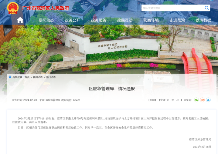 荔枝新闻讯 据广州市荔湾区人民政府网站,发布情况通报称:2月27日下午,广州一在建工地出现塌方,致2人遇难。