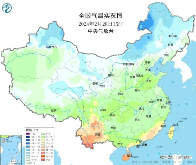 今天(28日)15时,南方大部还是大片冷冷的“绿色”,气温维持在10℃以下,有的城市甚至在5℃以下。