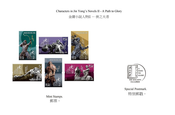 香港邮政2月29日宣布,将于3月14日发售一套以“金庸小说人物II——侠之大者”为题的特别邮票及相关邮品。