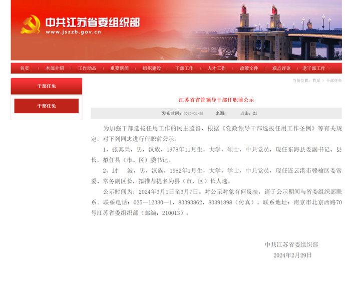 公示时间为:2024年3月1日至3月7日。对公示对象有何反映,请于公示期间与省委组织部联系。联系电话:025—12380—1,83393862,83391898(传真)。联系地址:南京市北京西路70号江苏省委组织部(邮编:210013)。