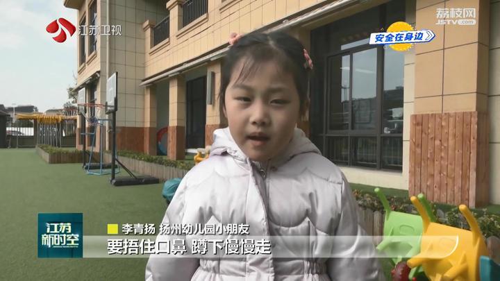 扬州幼儿园小朋友李青扬说:“要捂住口鼻,蹲下慢慢走。”