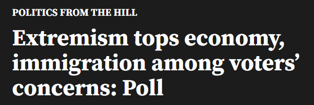 美国福克斯新闻旗下KDVR-TV电视台(FOX31 Denver KDVR-TV)网站援引《国会山报》的报道称,路透社/益普索(Reuters/Ipsos)27日公布的民意调查结果显示,美国选民目前最担心的并不是经济或移民问题,而是政治极端主义。