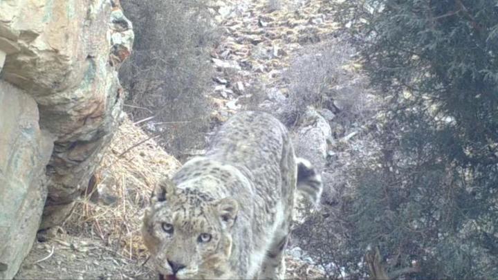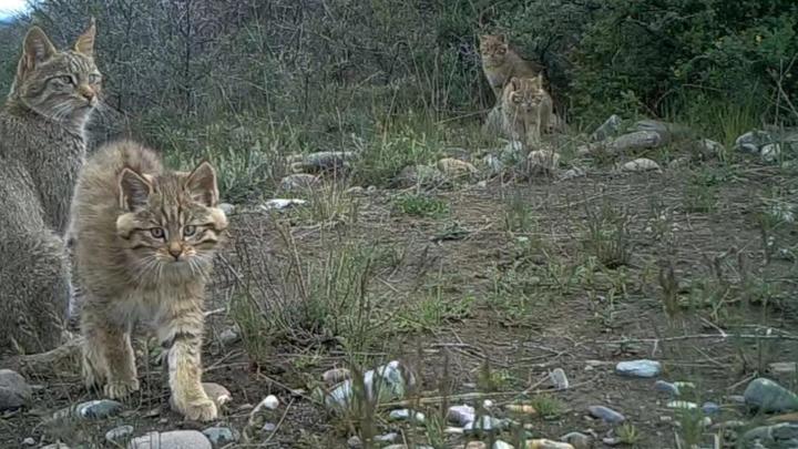 照片中的“大萌猫”一张是漫步在草丛中的荒漠猫,另一张是行走在树丛中的雪豹。二者都是国家一级保护野生动物。