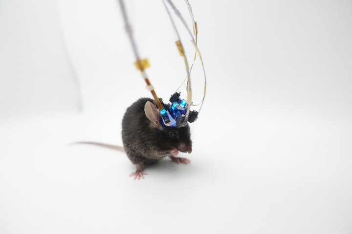 实验小鼠佩戴四个TINIscope显微镜实物图。科研团队供图