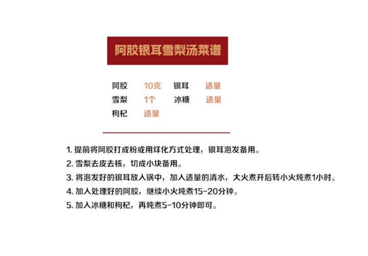 初春乍暖还寒,为了驱除冬季积累的寒气,迎接炎热的夏季,必须打好基础。沈教授为大家推荐了适合春季滋补的食补方案,阿胶银耳雪梨汤滋阴润肺,雪梨润肺止咳、真菌类的银耳具有很好的扶正固本,增强免疫作用,把阿胶打粉溶入银耳雪梨汤中,不仅味美香甜,还可以润肺止咳、美容养颜。平素肺部不适,易作燥咳的朋友,可以选择这样的食补方案,在家即可进行制作,简单便捷。