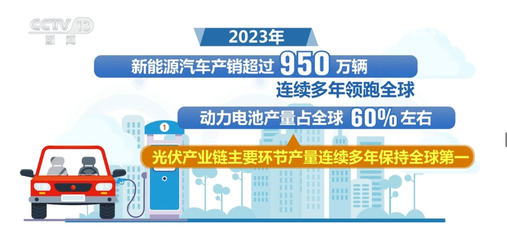 2023年,我国高技术制造业、装备制造业增加值占规模以上工业增加值比重分别达到15.7%和33.6%。新能源汽车产销超过950万辆,连续多年领跑全球,动力电池产量占全球60%左右,光伏产业链主要环节产量连续多年保持全球第一。