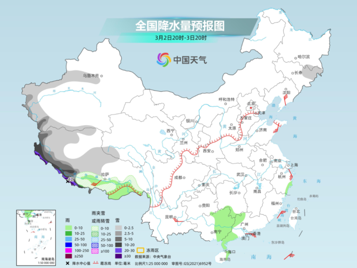 降雪最强时段为1日夜间至2日,阿里西部和南部、日喀则南部等地部分地区有大到暴雪,高海拔地区有大暴雪或特大暴雪(42毫米以上),新增积雪深度10~25厘米,高海拔地区45厘米以上。
