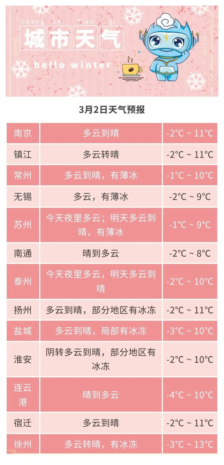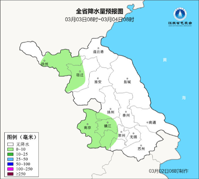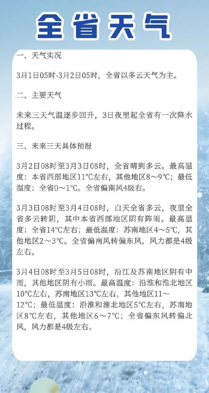 3月2日08时至3月3日08时,全省晴到多云。最高温度:本省西部地区11℃左右,其他地区8~9℃;最低温度:全省0~1℃。全省偏南风4级右。