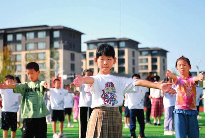 雄安史家胡同小学学生在操场上做体操(2023 年 9 月 13 日摄) 朱旭东摄 / 本刊