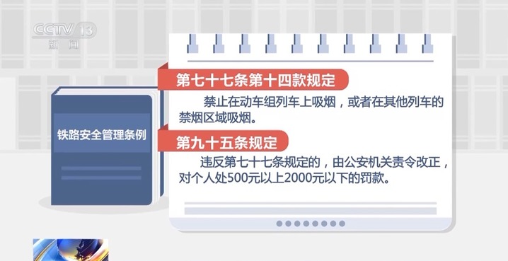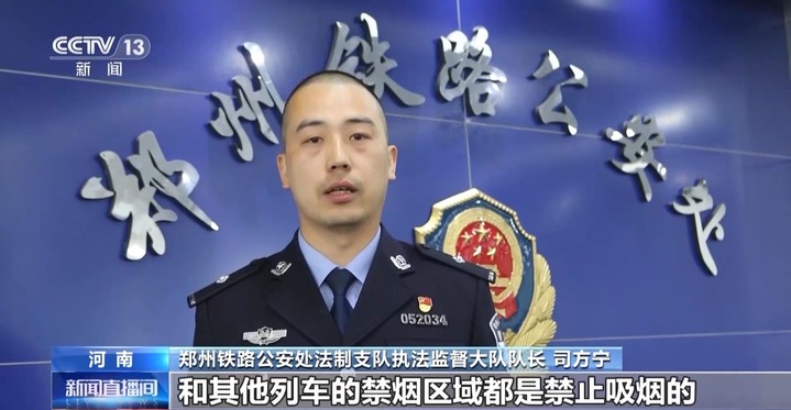 郑州铁路公安处法制支队执法监督大队队长 司方宁:动车组列车的任何部位和其他列车的禁烟区域都是禁止吸烟的,一旦违反规定,在没有其他危害后果的情况下,公安机关一般会根据《铁路安全管理条例》的有关规定,对违法行为人作出罚款的处罚决定。