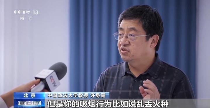 中国政法大学教授 许身健:吸烟本身是不构成刑事,但是吸烟行为比如说乱丢火种、乱丢烟头,带来火灾,那就构成犯罪了。受刑事处罚是吸烟引发的犯罪,再往下就是治安管理处罚,维护的是一个行政关系,维护的是公共秩序,不构成犯罪。再往下分一个层级,从严厉到比较轻,像一个漏斗一样,是这样一个关系。