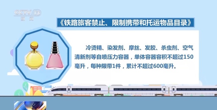 根据《铁路旅客禁止、限制携带和托运物品目录》规定,香水、花露水、喷雾、凝胶等含易燃成分的非自喷压力容器日用品,单体容器容积不超过100毫升,每种限带1件。