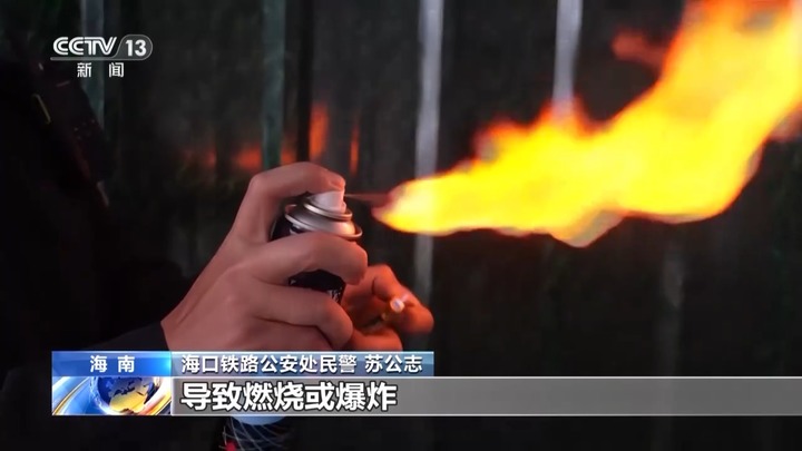 海口铁路公安处民警 苏公志:非自喷压力容器一般是塑料材质,自喷压力容器为底部凹陷的金属制品。按压时,喷嘴能够持续喷出,并在高温或碰撞下,引发罐内压力过大,导致燃烧或爆炸。