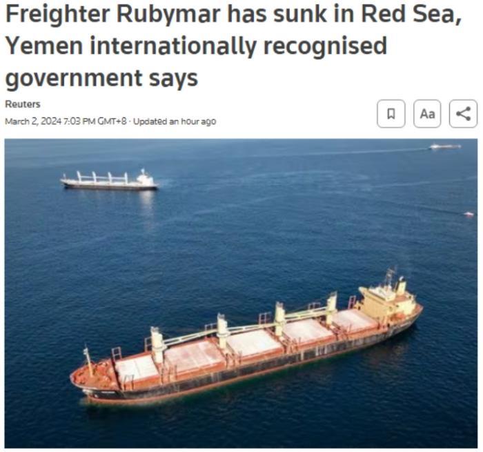 中新网3月2日电 综合外媒消息,当地时间3月2日,也门官员证实,此前被胡塞武装导弹击中的货船已在红海沉没。