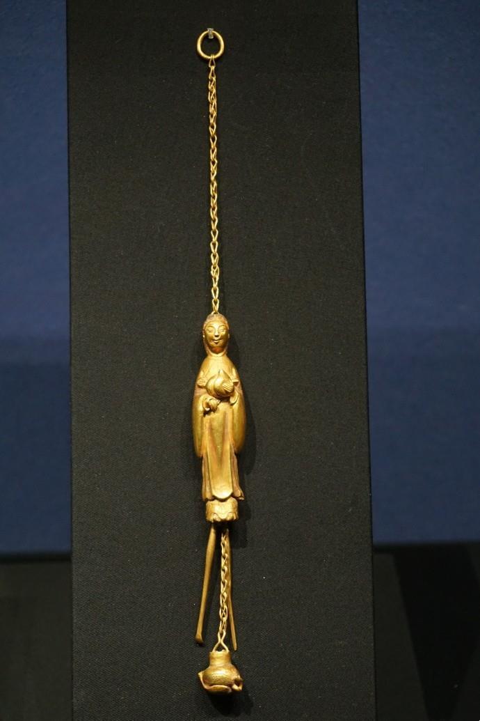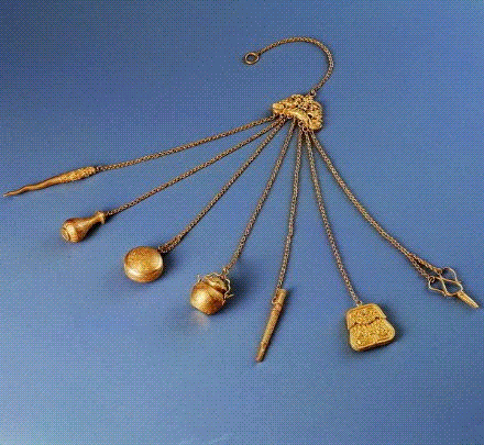 △錾花金什件,明代,七条链子分别连接剪、袋、剑、罐、盒、瓶、觿(xī,即锥子)。首都博物馆藏