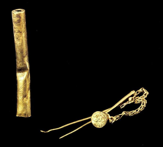 △明减银杂宝纹金事件,其筒内装有耳挖与牙签。浙江省博物馆藏