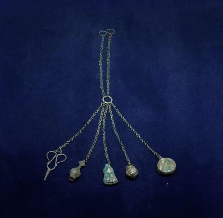 △银五事,链条下坠之物从左到右依次是剪刀、玉壶春瓶、荷包、水罐、粉盒,水罐或盛油,或盛刷鬓之水,应为女子佩戴。定州博物馆藏