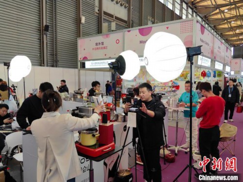 3月2日,第32届华东进出口商品交易会在上海新国际博览中心举办,一些参展商在展会上进行电商直播。 范宇斌 摄