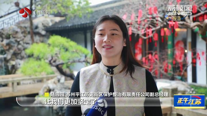 苏州平江历史街区保护整治有限责任公司副总经理陆园园说:“习近平总书记的到来,让我们更加坚定了把古城保护好、挖掘好、运用好的信念。过去的半年,我们不断打造街区特色消费场景和沉浸式空间,街区上店铺也是不断提档升级,街区发生了很多的新变化。我们将按照总书记的要求,继续做好历史文化保护传承工作,不断擦亮古城的名片。”