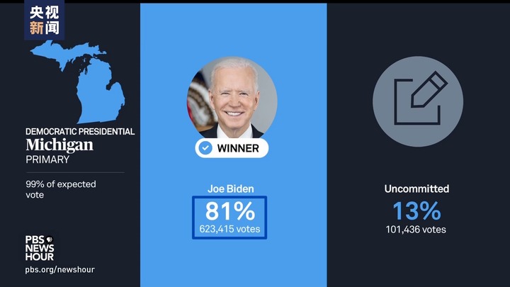 美国公共电视网指出,拜登在“面对空门”的局面下获得密歇根州约81%的民主党选票,但与此同时,有约13%的民主党选民投出了10万余张“不表态”票。这一比例远高于历届初选。