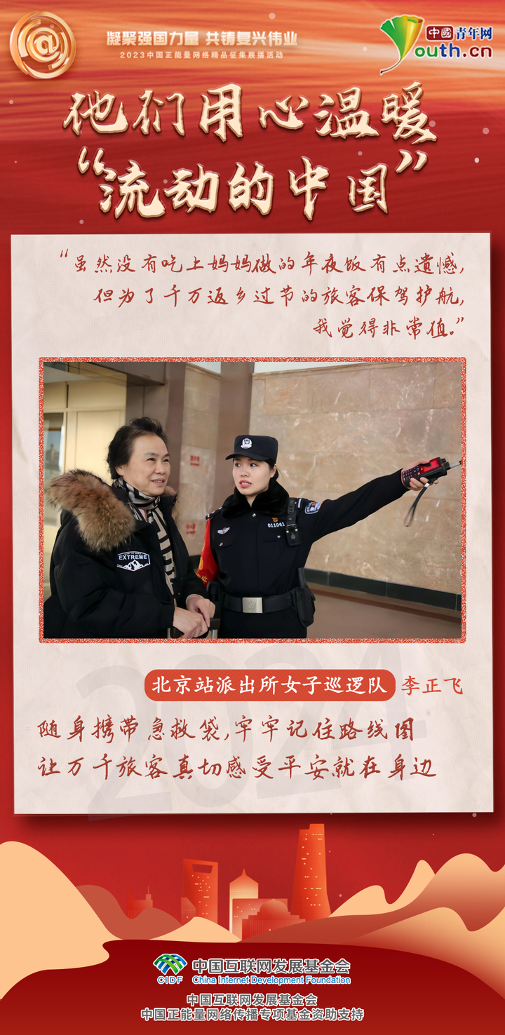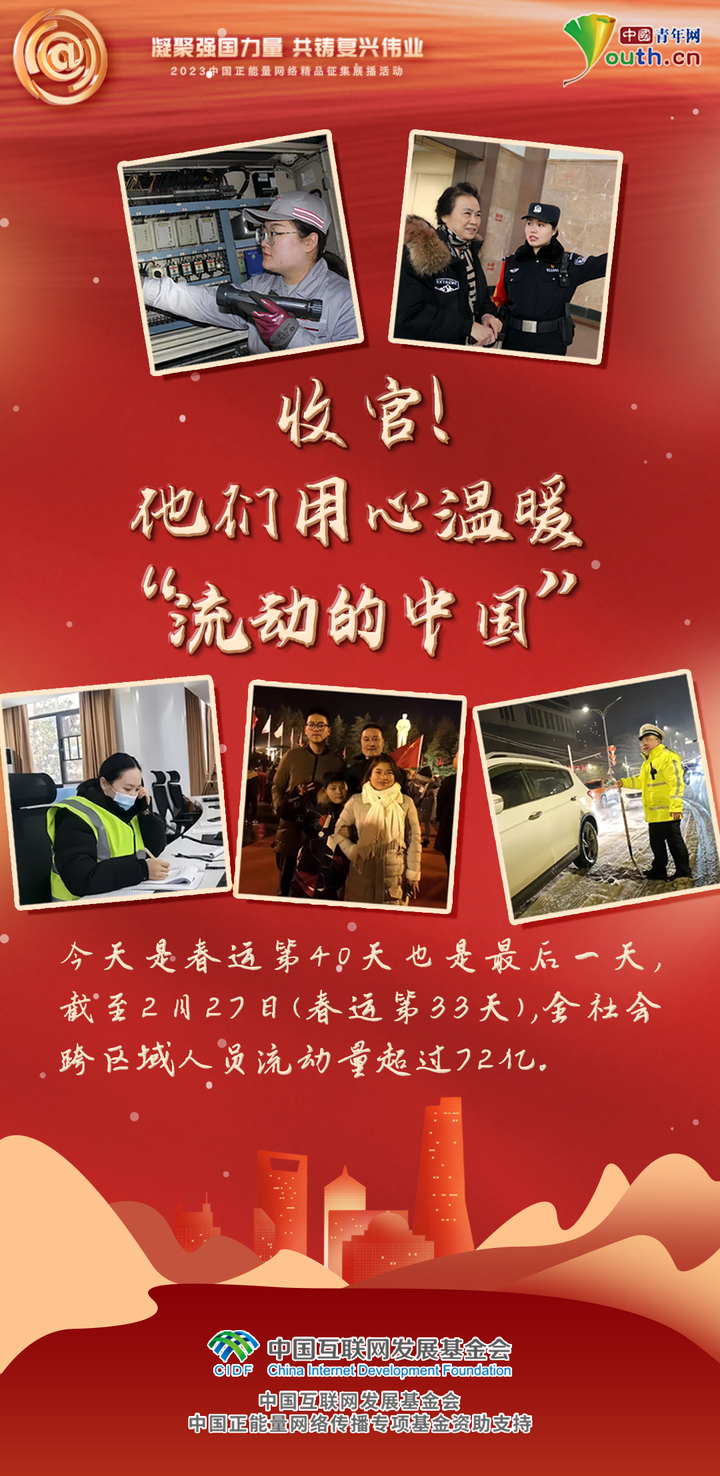 凝聚强国力量,共铸复兴伟业。今天,是2024春运的最后一天。40天的旅程里感动无处不在。有人坚守一线,用一声您好、一次搀扶诠释使命担当。有人雪中送炭,用一杯热水、一抹微笑温暖漫长旅途。微光汇聚正能量,春运路上,感谢有你们。(记者 刘尚君 见习记者 冯云慧 实习生 韩旭阳)