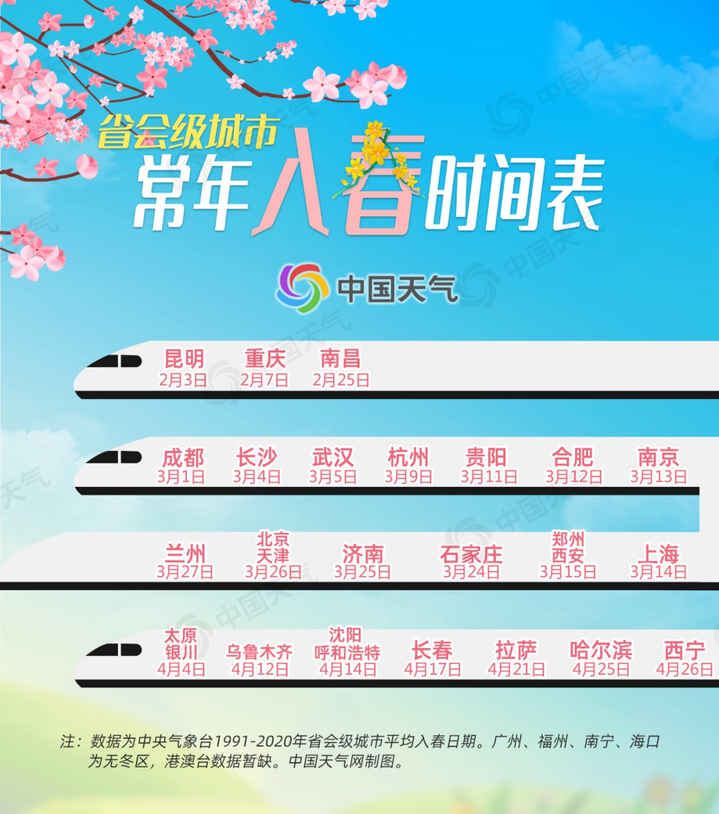 大城市来看,常年3月也是全国入春最集中的时间,成都、长沙、武汉、杭州等15个省会级城市会陆续开启入春进程。