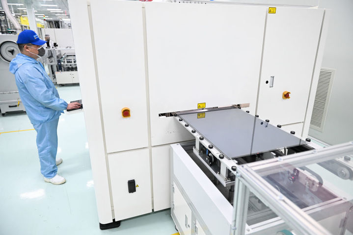 2024年2月29日,在位于江苏省无锡市锡山区的极电光能有限公司智能生产车间,钙钛矿光伏组件正在自动化生产线上进行激光划刻工艺。新华社记者 季春鹏 摄