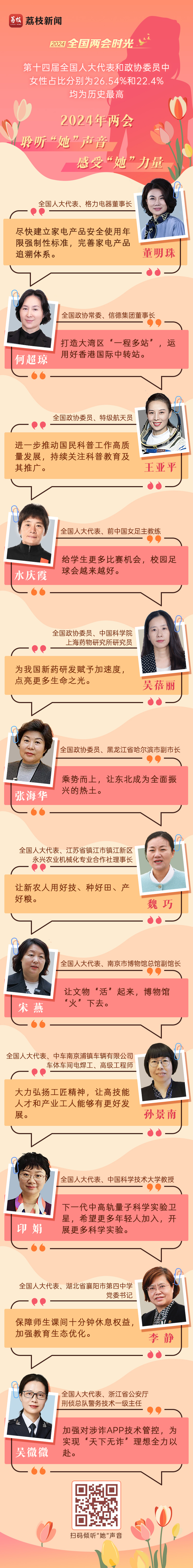 2024年全国两会正在北京召开,第十四届全国人大代表和政协委员中,女性占比分别为26.54%和22.4%,均为历史最高。女性代表、委员们聚焦发展大计、心系民生冷暖,为推动祖国事业持续健康发展鼓与呼,闪亮两会会场。