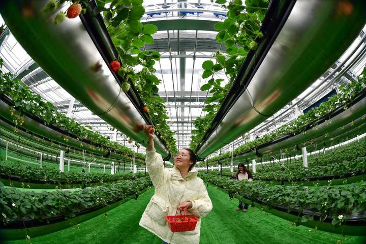 2023年12月28日,市民在肥西县柿树岗乡周楼村数字农旅果蔬大棚里采摘草莓。新华社发(徐勇摄)