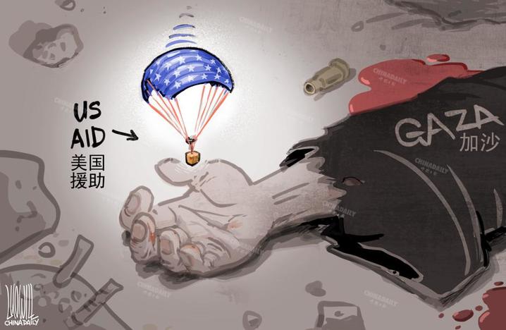 美国空投加沙的物资,来得太晚太少了。(来源:中国日报 罗杰 英文《中国日报》2024年3月8日8版)