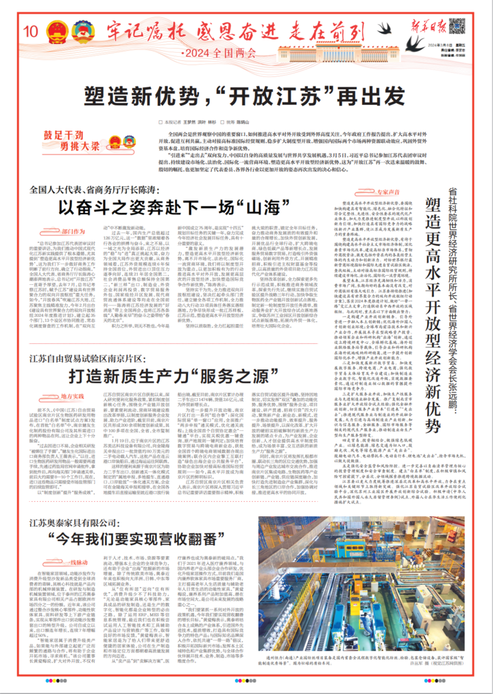过去一年,国内生产总值超过126万亿元,这一“数据”里浓缩着各行各业的拼搏与奋斗,来之不易。以一域之光为全局添彩,江苏以经济的“稳”与“进”真正挑起大梁,奋力为全国大局作出更大贡献。从商务领域看,江苏外资规模连续6年保持全国首位,外贸进出口顶住压力逐季向好,连续21年居全国第二,社会消费品零售总额保持全国第二,“新三样”出口、制造业、外资企业利润再投资、数字贸易服务外包、国家级经开区发展、现代商贸流通体系建设等均走在全国前列……陈涛将江苏经济发展的“好消息”带上全国两会,也将江苏各条线“人勤春来早”的奋斗之姿带给“春天的北京”。