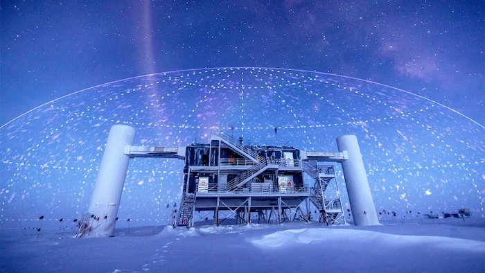 但高能中微子物理学家以在自然环境中建造别出心裁的探测器而闻名。冰立方中微子天文台利用体积为1立方公里的南极冰块探寻中微子的相互作用,而目前正在建造的立方公里中微子望远镜KM3NeT将在地中海进行探寻。这些探测器具有足够大的体积,可以捕捉到罕见的高能中微子。