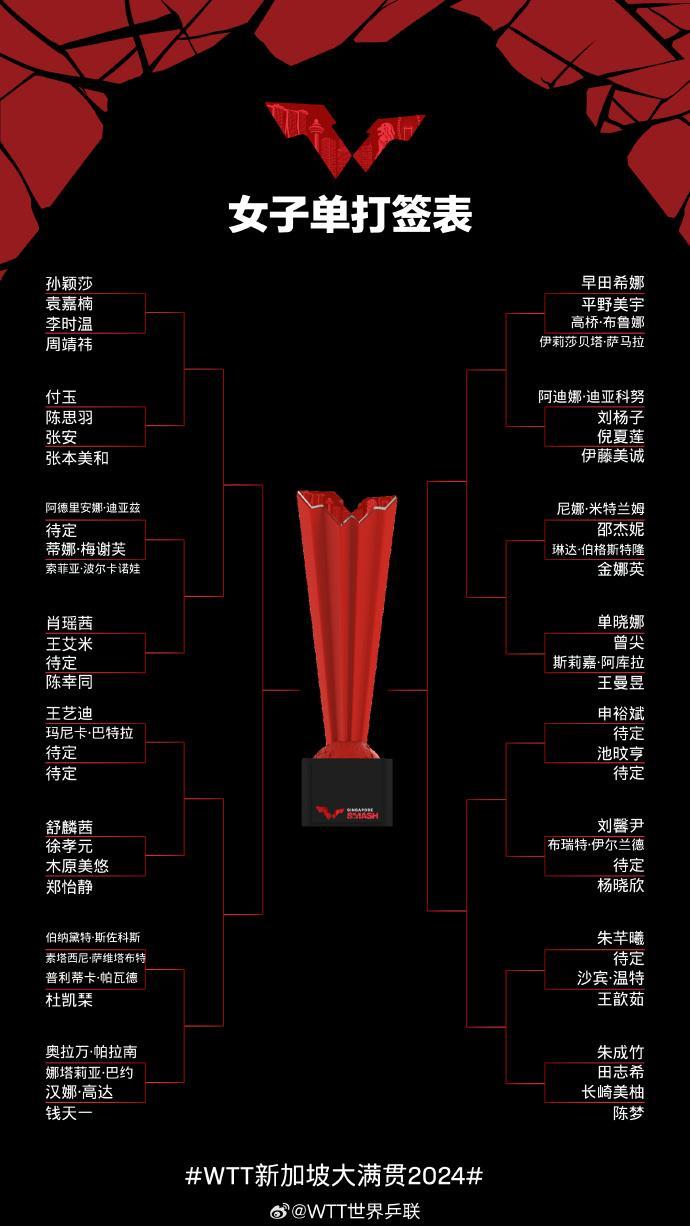 北京时间3月8日下午,WTT新加坡大满贯赛抽签仪式在新加坡举行,中国球员樊振东、孙颖莎作为球员代表出席抽签仪式。男单签表,樊振东首轮对阵卢伟,女单签表,孙颖莎首轮挑战袁嘉楠。央视体育将会转播部分比赛。