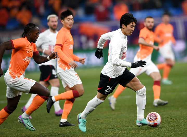 3月8日,长春亚泰队球员元敏诚(前右)在比赛中带球突破。新华社记者 李紫恒 摄