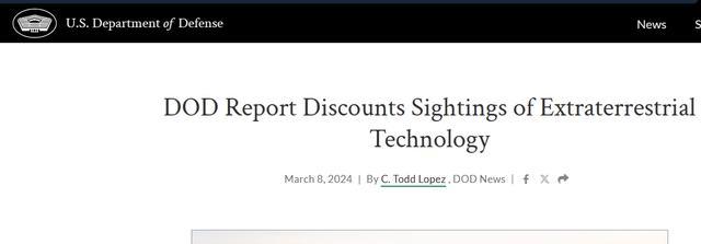 五角大楼新闻秘书帕特·莱德少将在一份声明中说,五角大楼上周向国会递交了两卷报告中的第一卷,报告摘要称AARO没有发现任何证据表明目击到的UFO存在着外星技术。