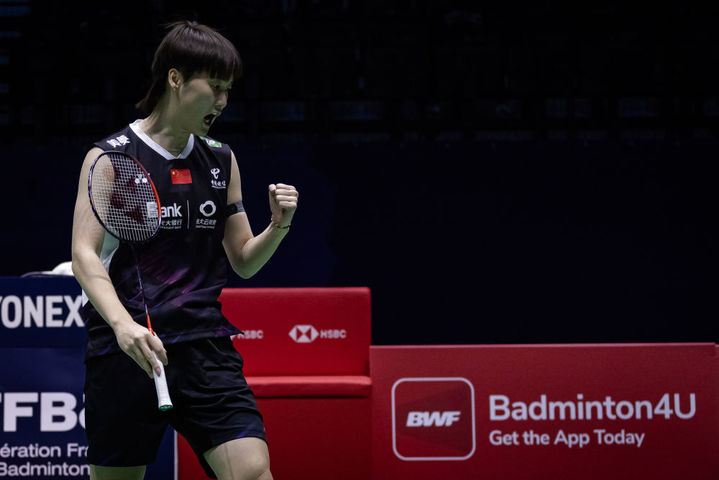 3月8日,陈雨菲在比赛中庆祝得分。新华社发(奥雷利安·莫里萨尔摄)