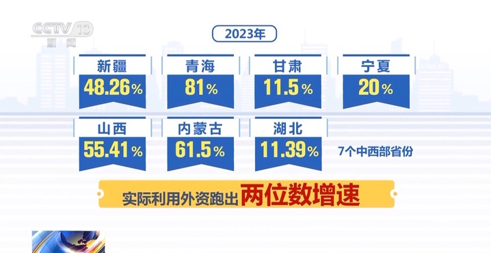 密集落地的外资项目,折射出“磁吸力”的不断增强:2023年,新疆、青海、甘肃、宁夏、山西、内蒙古、湖北等7个中西部省份,实际利用外资纷纷跑出了两位数的增速。广袤的中西部地区,日渐成为吸引外资新的“高地”。