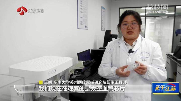 东南大学苏州医疗器械研究院细胞工程师王妍说:“我们现在观察的是太空血管芯片,它可以模拟空间失重条件对人体血管的影响。同时,我们可以在显微镜下实时观察药物对血管的保护性作用。”