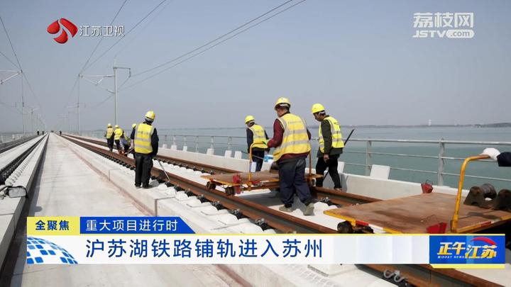 3月9日,在沪苏湖铁路青浦特大桥,随着一对500米长钢轨被铺轨机平稳、精准地铺设到无砟轨道床上,沪苏湖铁路铺轨作业正式进入苏州境内。