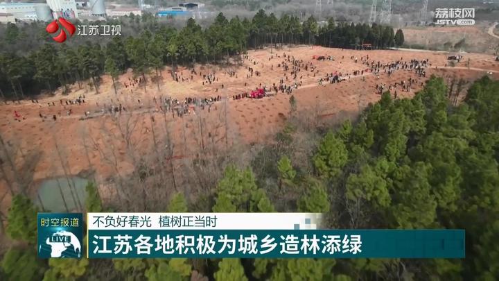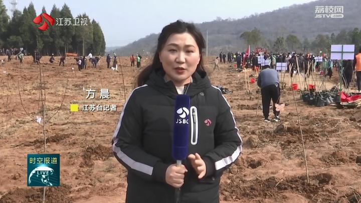 江苏台记者方晨说:“现在,我们来到句容市林场。在现场我们可以看到,来自江苏省级机关35家单位的700余名职工,正在这里参与义务植树活动。”