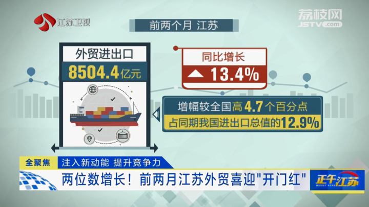记者从南京海关获悉,今年前两个月,江苏外贸凭借坚实的产业基础、良好的营商环境实现两位数增长,增长表现亮眼,竞争优势巩固。
