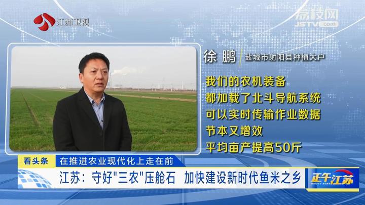 盐城市射阳县种植大户徐鹏说,农机装备都加载了北斗导航系统,可以实时传输作业数据,节本又增效,平均亩产提高50斤。