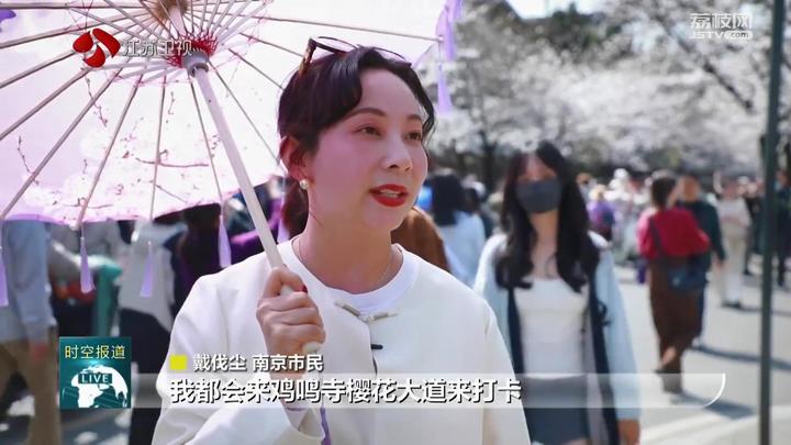 江苏台记者王敏:“春暖花开,南京鸡鸣寺的樱花也如约而至。大道两旁的樱花次第绽放,粉白的花瓣在微风中轻轻摇曳,吸引了众多游客拍照打卡。”