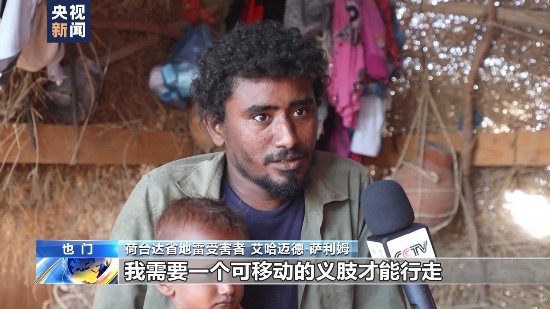 荷台达省地雷受害者 艾哈迈德·萨利姆:我的情况只能到国外治疗,我需要一个可移动的义肢才能行走。我的一条腿还有膝关节可以活动,另一条腿就没有了。埋设地雷是天大的罪孽,受害者绝大部分是无辜平民。