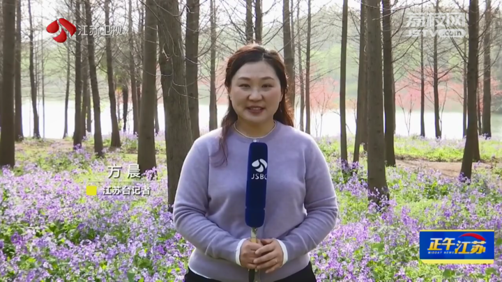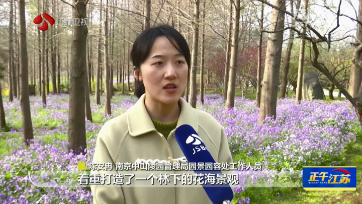 江苏台记者方晨:“这里是南京的明孝陵景区,在燕雀湖附近我们可以看到,盛开的二月兰连成紫色的花海,浪漫非凡。”