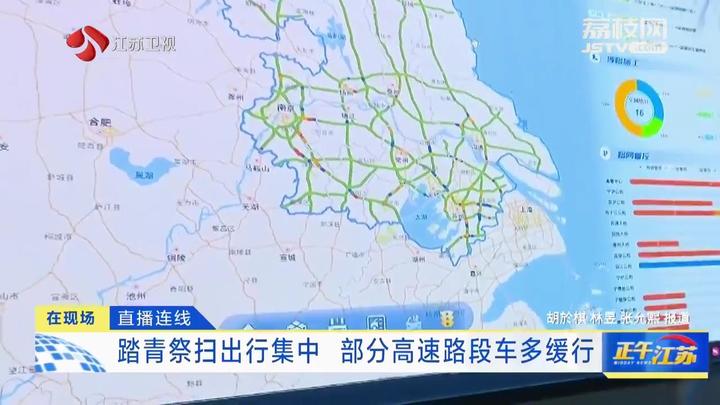 江苏台记者胡於棋:从江苏省高速公路调度指挥中心实时大屏可以看到,今天江苏全省的天气晴朗,比较有利于交通出行。其实从早间开始,全省高速路网的车流量就在逐渐上升。上午9点到10点钟,也是迎来了今天的一个车流的高峰,到了午饭时间,车流反而是有所下降的。通过大屏显示,记者看到目前的车流相对比较大的地方,主要还是集中在像南京、无锡、常州等一些城市的周边。今天,虽然高速路网车流比较大,但是从总体来看,通行状况还是比较不错的。另外需要值得注意的是在相邻省份中,因为从南京去往安徽祭扫踏青的人可能会比较多,交管部门此前也预计,日均车流量可能达到63.4万辆,但是从今天上午的实际情况来看,包括像宁洛、宁马等前往安徽的高速公路整体的通行情况还是比较不错的。