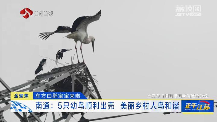 在南通如皋市高压铁塔上筑巢的一对东方白鹳也传来了好消息,5只鸟宝宝成功孵化,目前已出壳十天左右,身体状况良好。